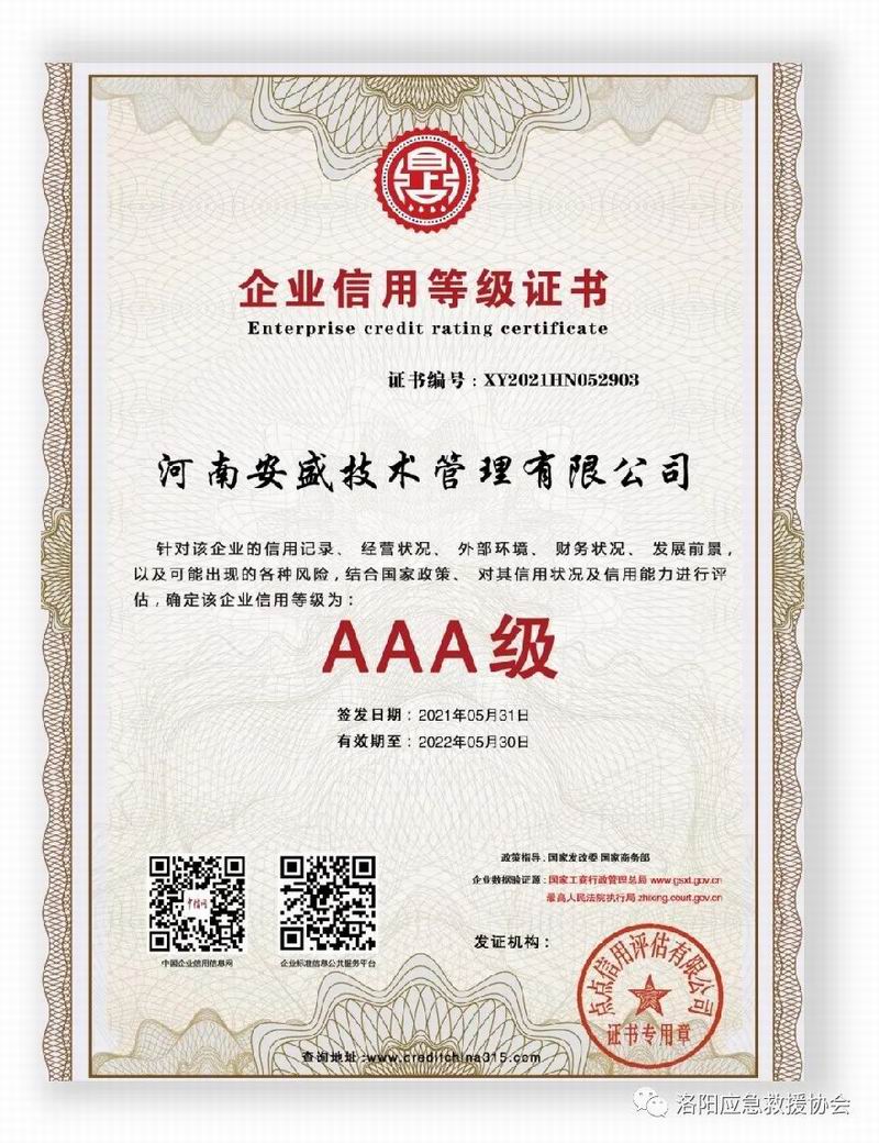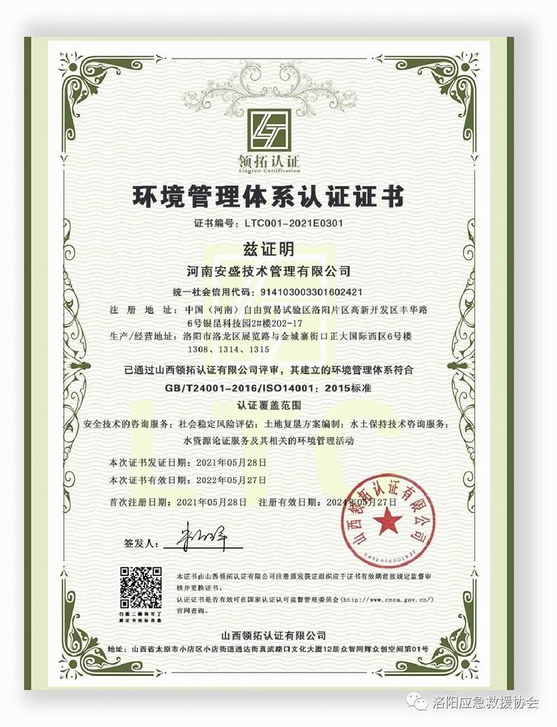 河南安盛技術(shù)管理有限公司被洛陽市應(yīng)急救援協(xié)會授予會員單位牌匾